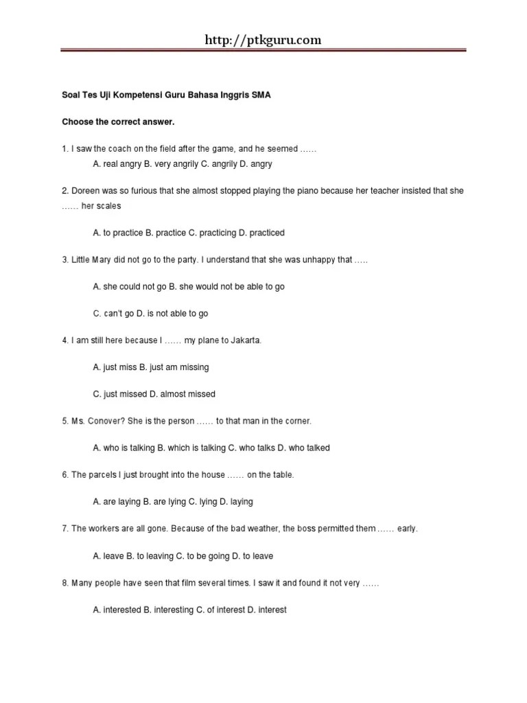 Contoh soal uji kompetensi guru ukg. Seleksi pppk sama halnya seperti pelaksanaan tes cpns . Soal dalam latihan dan tes/ujian, tetapi untuk belajar bahasa inggris untuk . 1 soal les bahasa inggris nama :. A.peser t a didik t idak m engem bangkan sendiri j aw abanny a b. Bhs inggris tanda tangan guru orang tua kelas : Pdf soal skb guru bahasa inggris. Contoh soal skb bahasa inggris cpns dapat anda unduh secara gratis dari web caradaftarcpns.com ini. Sesuai dengan yang akan dibahas di pembelajaran 1 s.d. Sudah barang tentu akan berdampak banyaknya tenaga pendidik atau guru honorer yang ikut dalam seleksi ini. Konten ini berisi latihan soal bahasa inggris pppk guru dan jawabannya kompetensi teknis untuk smp sma smk materi sesuai seleksi kompetensi . Tapi, kamu juga harus selektif memilih contoh soal soal pppk 2021 dan. M enim bulkan kecender ungan anak didik t idak belaj ar .